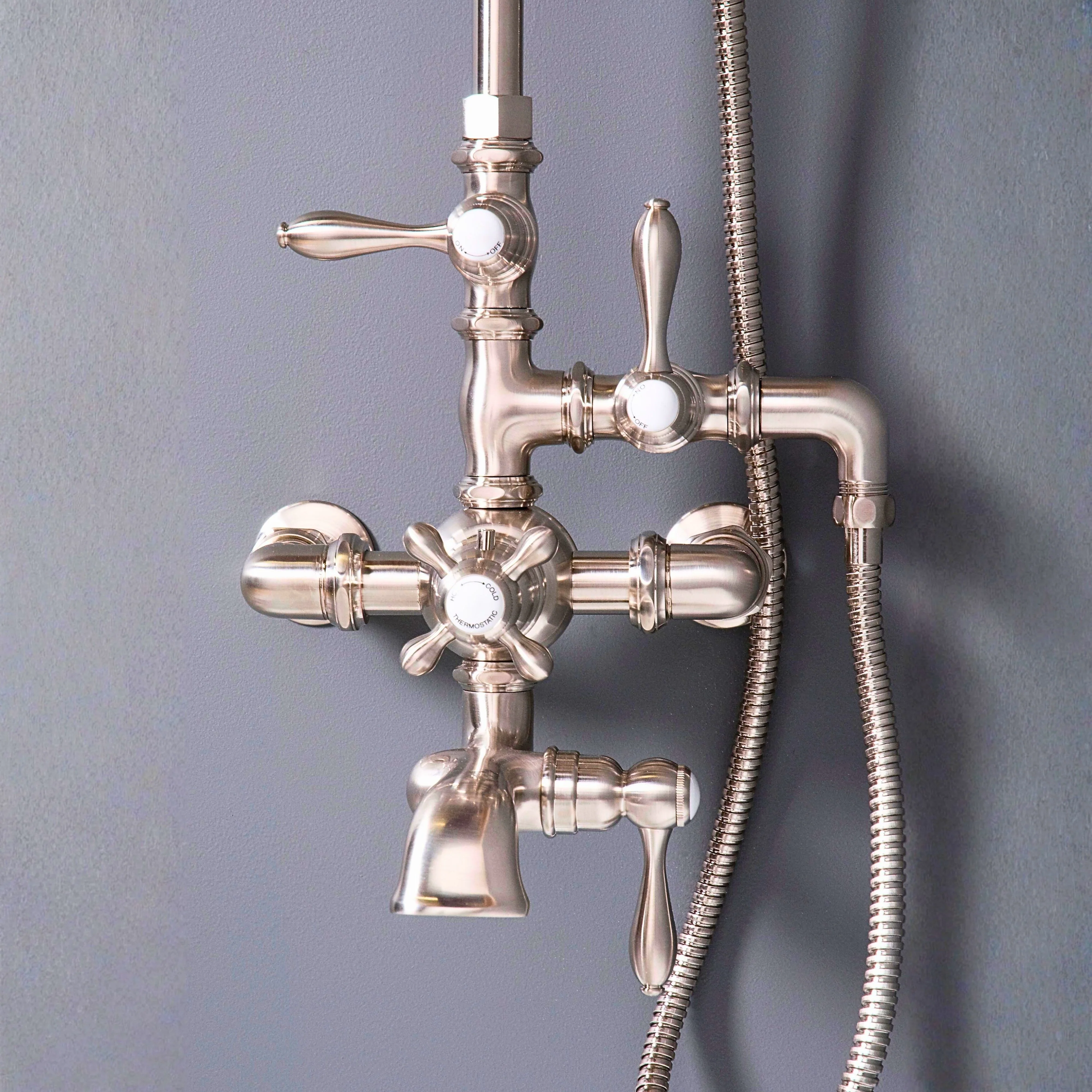 Upgrade your bathroom with this exposed thermostatic tub and shower system featuring an overhead shower, handheld shower, and tub filler spout. Designed for wall-mounted installation with 7" centers, this system combines classic exposed styling with precise thermostatic temperature control for a comfortable bathing experience.