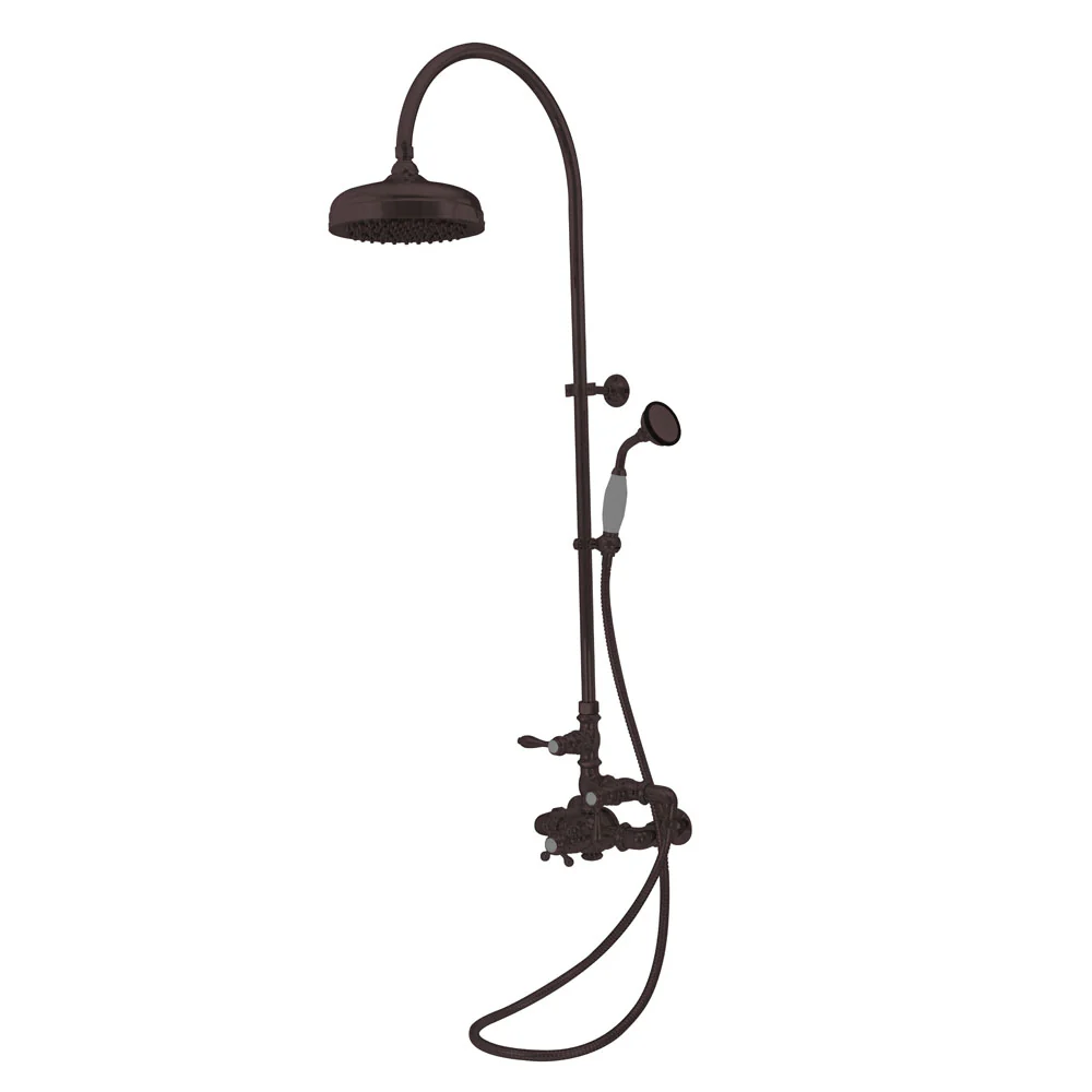 Upgrade your bathroom with this exposed thermostatic shower system featuring a gooseneck riser, overhead shower head, and handheld shower. The exposed thermostatic valve maintains precise temperature control while creating a timeless exposed plumbing design ideal for traditional or transitional bathrooms.