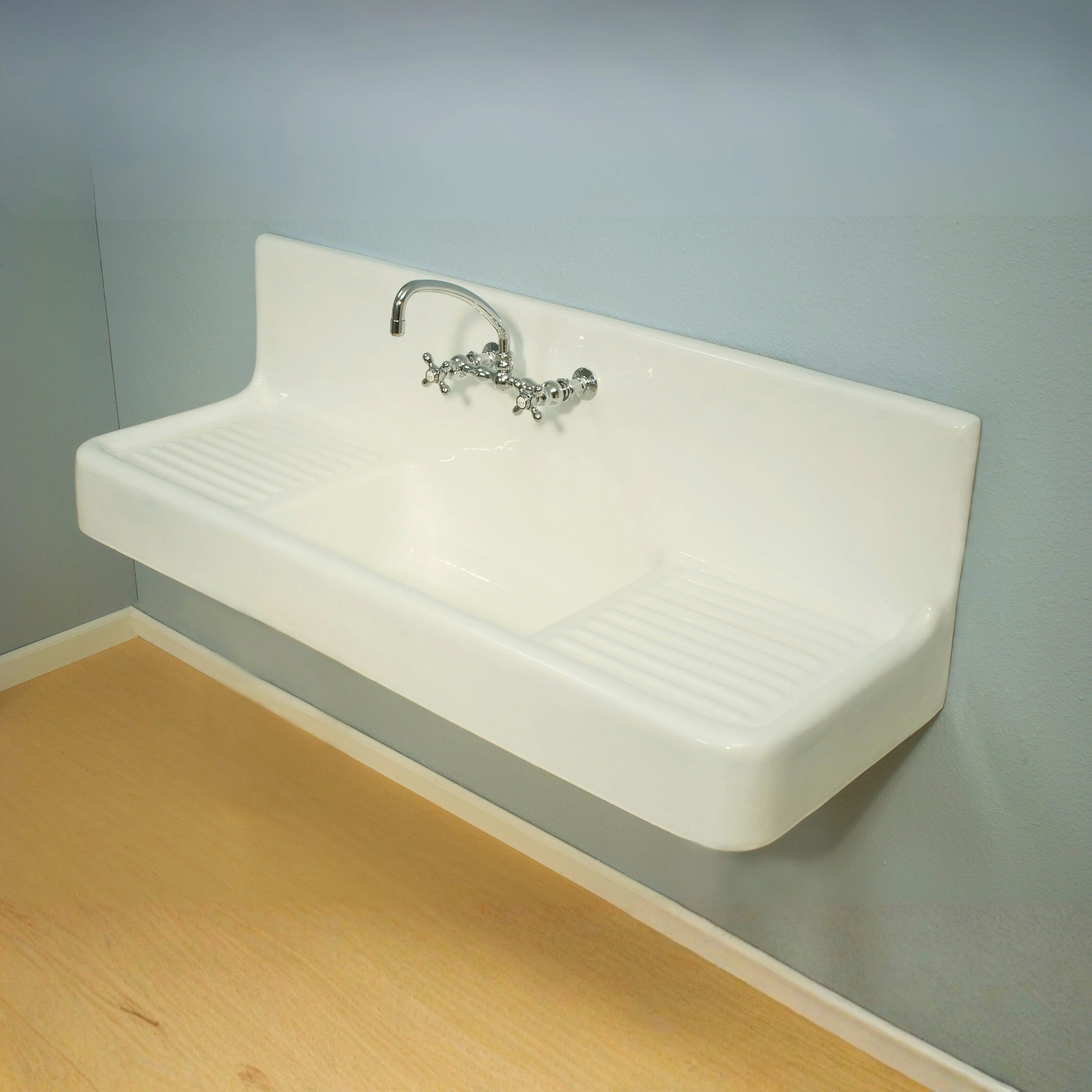 Constructed from solid cast iron, this wall-mounted sink offers exceptional durability and long-lasting performance. The integrated drainboard provides generous workspace for drying or prep, while the pre-drilled 8-inch faucet holes allow for easy installation of traditional or modern faucet styles.